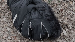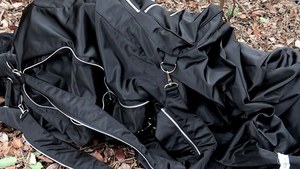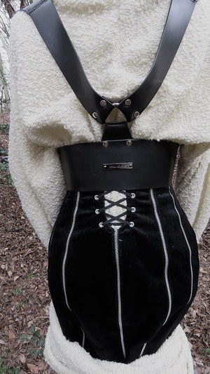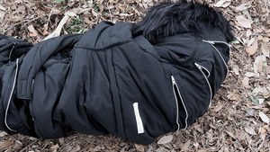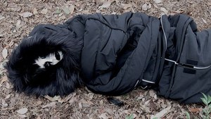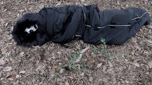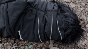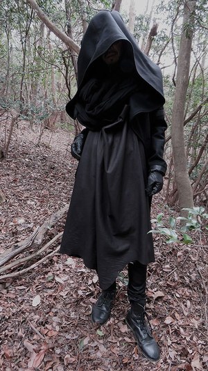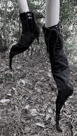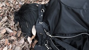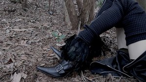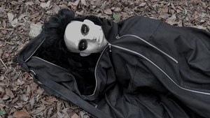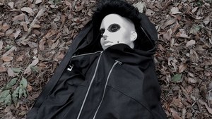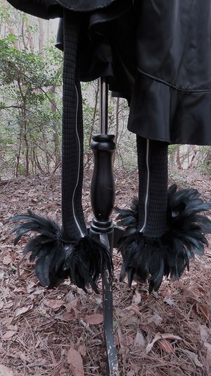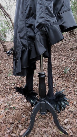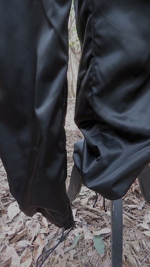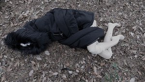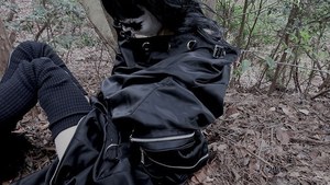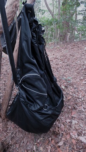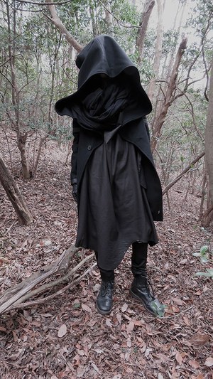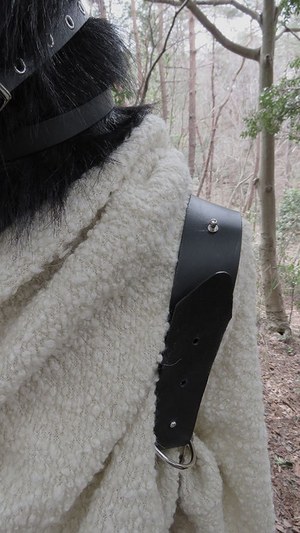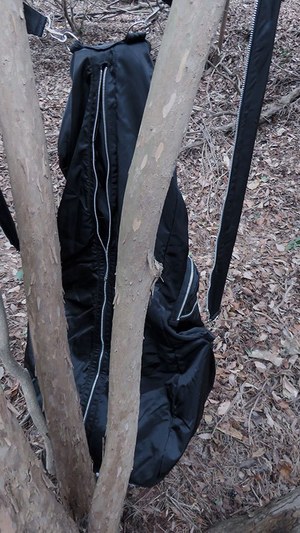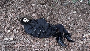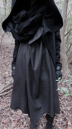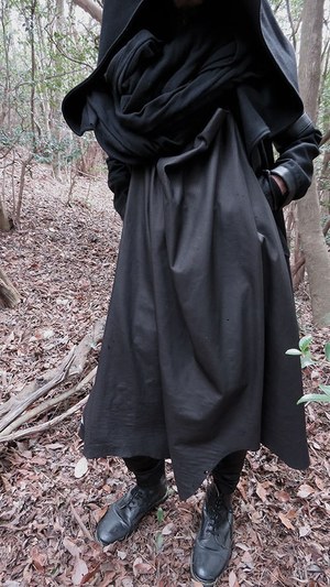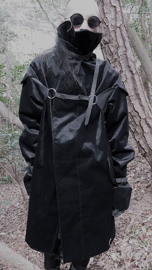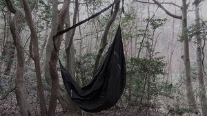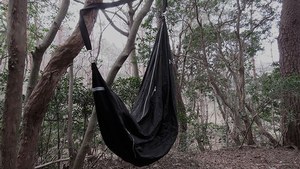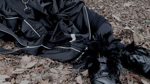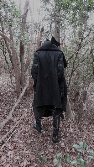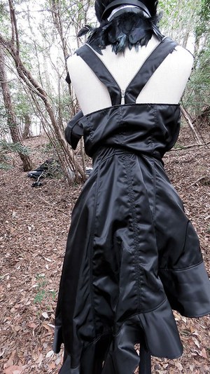落ち葉に覆われた土地に吊り下げられたミノのような黒いバッグ。その弛みから、内側に蠢く生命が垣間見える。Bagの響きから、ワードローブ自体もカバンのようなアイテムが多く登場。ジッパーの開け閉めにより、立体的なイメージがより掻き立てられる。