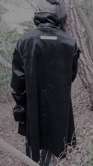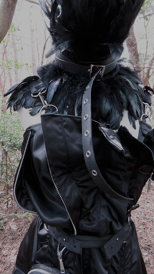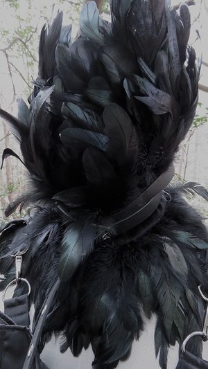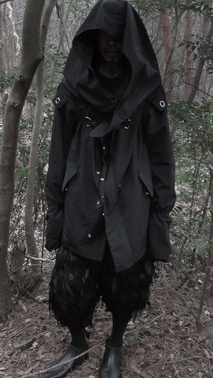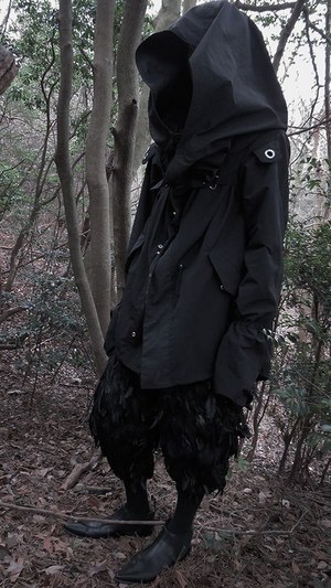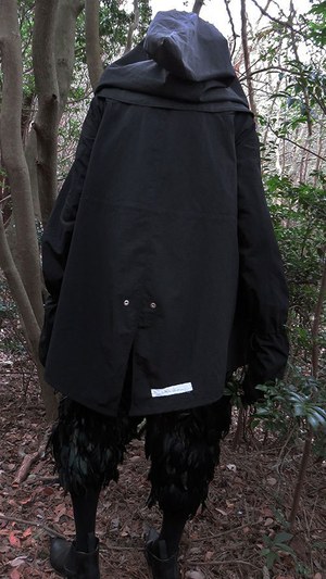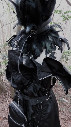 ウェアはミリタリーテイストを反映したものが多く披露された。そこに、鳥の羽を使用したパンツを合わせることで、黒のワントーンながらも色彩に強弱を演出。ハードな印象に一閃、モード感が加わった。