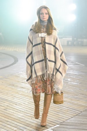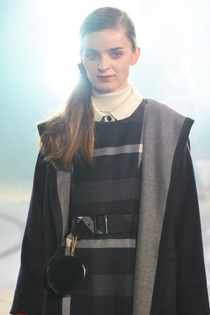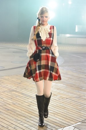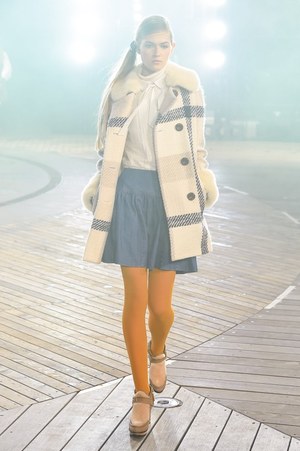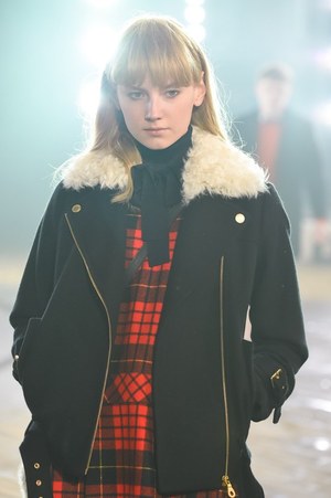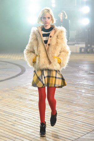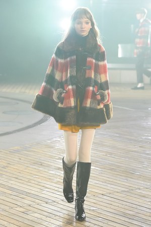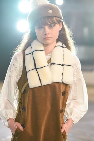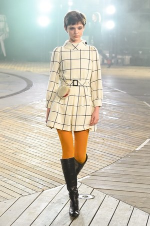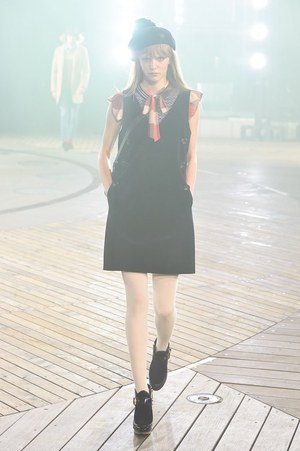 ウィメンズウェアは、「ツイッギー」をアイコンにとことんガーリーに仕上げた。ウエストラインを高くしたワンピースや優雅なフレアラインを描くミニドレスには、カラータイツやポンチョ、ベレー帽をあわせて、少女性を追求する。