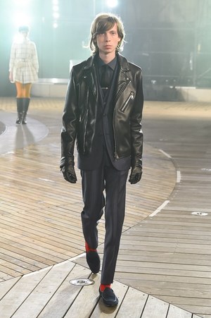 一方で、ほんのり香るストリートの要素もポイント。ボトムスはクロップド丈に設定され、裾からカラーソックスをのぞかせて。アウターラインからは、ドロップドショルダーのロングコートやライダースジャケット、スタジャンなども登場し、モダンさを意識させた。