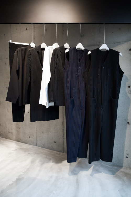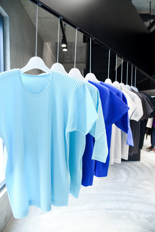 1階にはTシャツやジャケット、パンツといったベーシック製品が、2階にはシーズンウェアが並ぶ。オープン時には、1階で他店に先駆けジャンプスーツを発売。また「MIYAKE ISSEY展: 三宅一生の仕事」のWALKING FLYERも販売されている。