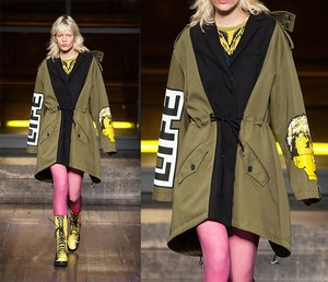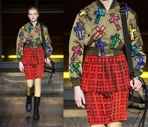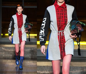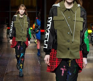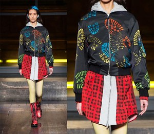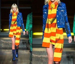 今季の起点は、デザイナーのジェレミー・スコットがイギリスの現代美術家ギルバート&ジョージを尋ねたところから。鮮やかな色彩、挑発的な性質。表情豊かな彼らの作品に心を奪われたジェレミーは、2Dの世界から3Dの世界へと昇華させ、アートピースのように鮮やかなウェアを作り出した。