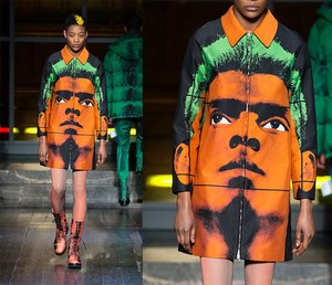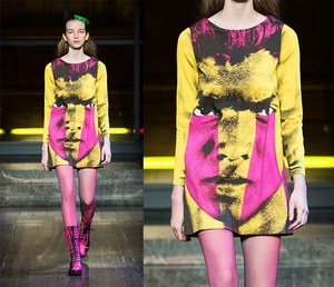 男性の顔を大胆にあしらったプリントドレスは、鮮やかな色彩を用いて、アグレッシブに仕上げた。タイツ、ブーツもピンクカラーで揃えれば、主張の強いアイテムもまとまりのあるスタイリングに。