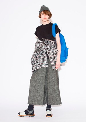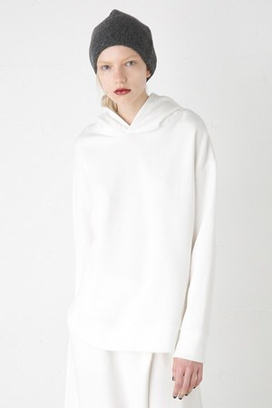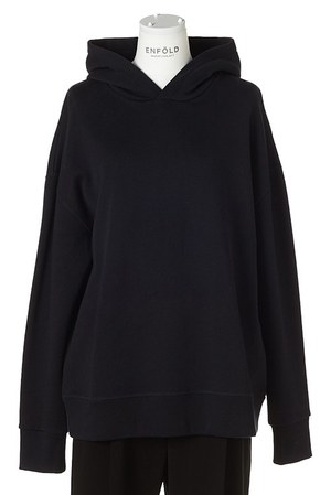 また、フードパーカーは、ユニセックスでも大きすぎないサイズ感。肉厚な生地に裏起毛を採用して、さらに着心地を追求した。ローゲージの糸でラフに編んだニットは、メンズの標準サイズを女性が着た時のサイズ感を想定。一方、リブ目やラグランスリーブ、どっしりと密度の高い編地もメンズライクなムードを運ぶ。