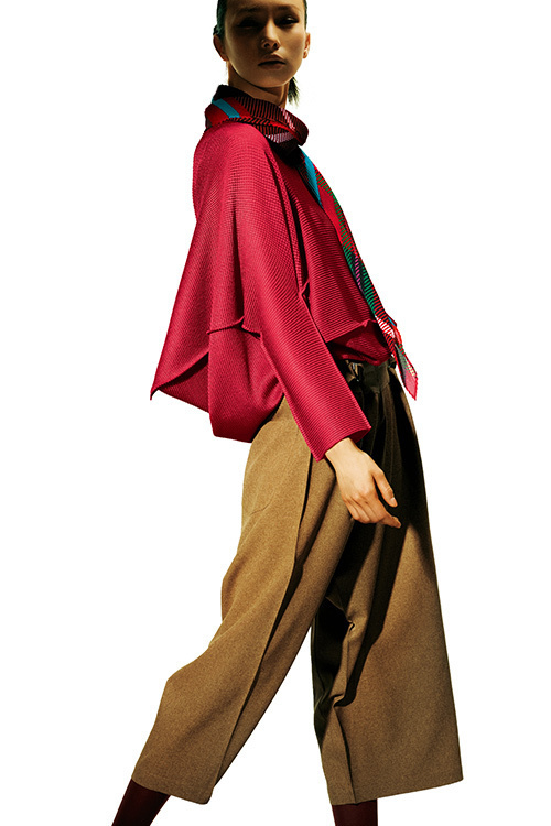旅には欠かせないトランクからインスピレーションを得て、“四角い形を着る”をコンセプトにしたトップス。生地には、コンピュータ・テクノロジーを用い、一本の糸から一体成型で服をつくりだす製法“A-POC”で生み出されたストレッチプリーツを採用。平面から立体へ、着用時に現れるドレープ感が大人っぽいシリーズだ。