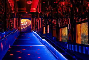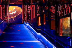 期間中は、長さ約50mのスロープの壁と天井に約5,000枚の鏡を貼り詰めた展示エリア「万華鏡トンネル」がハロウィン仕様に様変わり。例えば、通常時に見られるブルーのライティングは、ハロウィンを感じる赤やオレンジに変化。また8個のクラゲ水槽内には、“魔女”や“カボチャ”のパネルを取り付けたことで、水中に漂うクラゲたちがハロウィンを楽しむ“オバケ”のように見えるユニークな演出も施されている。