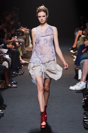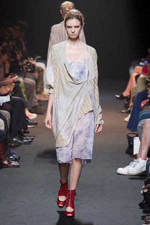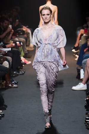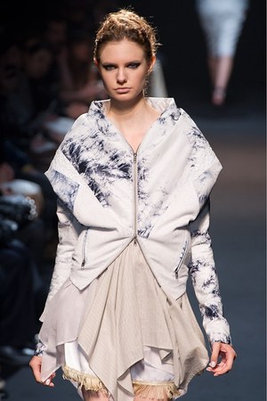 ディアスキンの繊細な表情を引き出したドレスやジャケットは、ブランドのシグネチャーでもあり、また今回のテーマを象徴するアイテム。ディアスキンを極限まで薄く漉き、そこに箔を重ねたりひっかくように削ったりしてヴィンテージの風合いを出した。体の中心へと重心を置いたジャケットや前で大胆に結んだようなデザインのワンピース、美しいドレープを描く沢山のアイテム達は、造形的でアート作品のような完成度。また大理石やダイヤモンドのかけらを敷きつめたような美しいプリントで、観客を幻想的なムードへと引き込んだ。