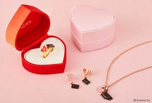 1ピースのチョコレートとハートがセットになった「チョコレートラバーズ リング」。情熱的なレッドと乙女なピンクの2カラーで展開され、バレンタインらしいハート型のボックス入り。他にも同デザインのピンやネックレスが登場するので、合わせて身につけるのも良さそう。