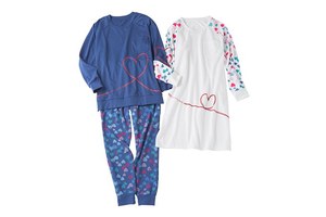 お揃いで着ると、プリントの運命の赤い糸で小指と小指を結んだようなデザインになる「運命の赤い糸パジャマ」。メンズはブルー、ウィメンズはホワイトで、それぞれカラフルなハートが散りばめられ他ロマンチックな一着だ。