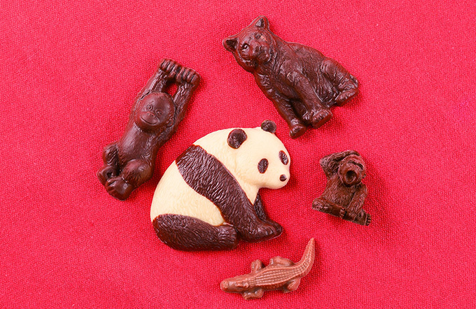 また、ズーロジーが展開する「ディクショナリーS」はパンダや猿など、リアルな5匹の動物を、チョコレートで精巧に再現したもの。さらにパッケージには動物たちの体長や体重も記載されており、図鑑のように見て楽しむことができる。