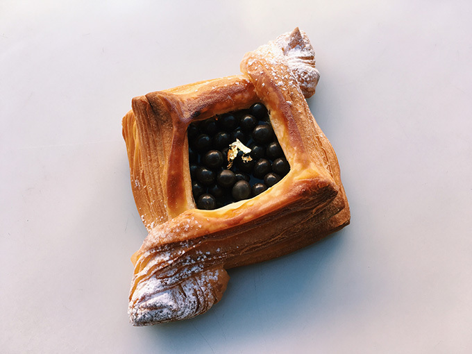 クロワッサンの生地の中にプラリネのカスタードとショコラを重ね、粒チョコを敷き詰めて仕上げに金箔をあしらった高級感あふれる「パールショコラ」。サクサクの生地と粒チョコの食感が楽しいパンだ。