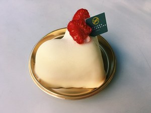 「クールブラン」はフランボワーズのジュレをホワイトチョコのムースで包んだケーキ。クールブランとはフランス語で白いハートという意味であり、白のハート型にフレッシュなフランボワーズの赤をアクセントにして愛らしい見た目に仕上がっている。底はサクサクのサブレ生地で、食感も楽しめる。