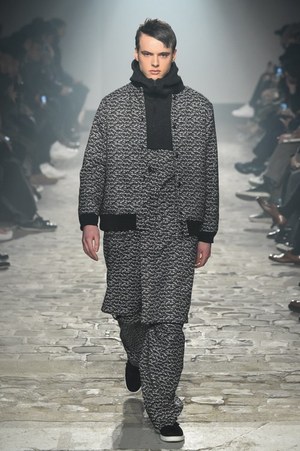 序盤のブラックをメインとしていたなかでのツイード素材の切り替え、ジッパーやベルトで変化を施しているのが面白い。そこにプラスされていくジオメトリック柄は足元にまで達していく。印象的であったインクジェットプリントによる鮮明な枯れ木模様のプリントは、スーパーレイヤードで奥深く楽しめる。