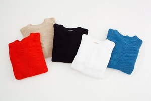 一方メンズは、定番ニット「セルジオ」がレッド・ブルー・ベージュの鮮やかなカラーになって展開される。丸首デザインなので、インナーで遊びを利かせるのもおすすめ。素材にはマーシャライズドコットンを使用し、いつものセルジオとは違った柔らかな風合いもポイントだ。