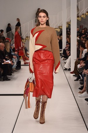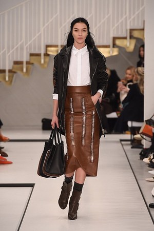 合わせたのは、細みのレザーパンツが主流であるが、中にはフェミニンなアイテムも存在する。美しいドレープの効いたスカートは、ナイロン素材で仕立てたもの。赤色でアクセントを効かせたレザースカートも、膝下レングスで上品な印象だ。