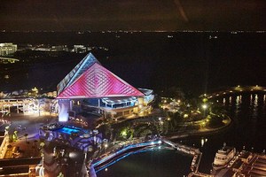 生き物たちのショー以外に、アクアミュージアムの幅55m、高さ18mもの巨大な大屋根をスクリーンとした光のショー「スカイ ライト マジック~夜桜~」も見どころのひとつだ。様々な海の生き物たちが桜の花びらとともに夜空へ舞い上がる様子が、春らしい音楽と共に上映される。
