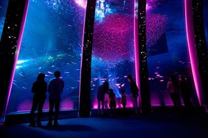 ピンク色のライティングで染められたイワシたちが、大水槽中央に設置された擬木と重なり合うように群れ泳ぎ、桜を作り出す。満開を迎えたイワシの桜がやがて桜吹雪となって散っていく様は必見だ。