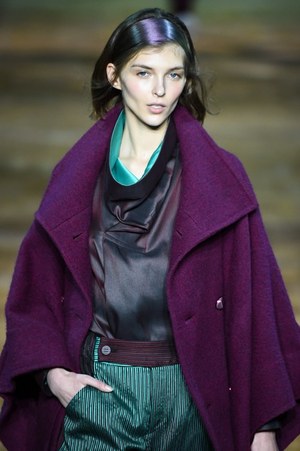 波打つように揺らめき、輝きながら変化を遂げるオーロラ。今季は、その幻想的な光景から着想を得て「AURORAL」シリーズを生み出した。ブラックからグリーンへ、パープルからブラックへ見る角度によって色彩の深みが変化するテキスタイルは、ウルトラスエードをスリット状にし、織り込んだもの。オーロラの下で育ったシェットランド産の原毛を5色に染め上げ1本の糸に配合させた直線的なコート。裏地がよく見えるフーディなどが用いられ、豊かな色彩のコンビネーションで視覚的な楽しみをもたらしてくれる。