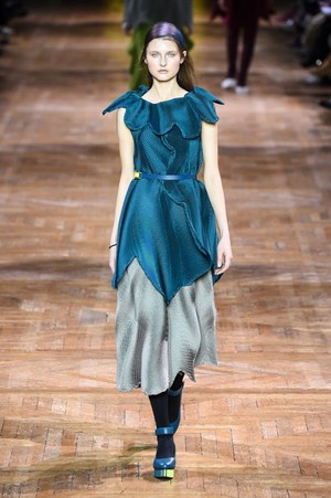 この生地は、ショーの中盤から登場するのだが、曲線的な表現がとても巧み。ヘムラインや裾、襟元などで花のようにふわっと開く。このアウターとドレスを合わせてスタイリングすると、花束のようにゴージャスで優雅な佇まいに。