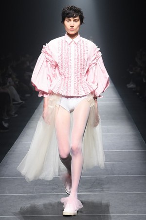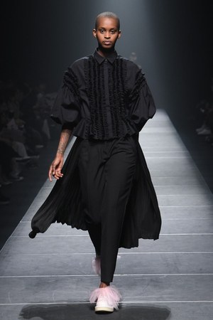 序盤は、”黒とピンク”そして”強さと可憐さ”というを対立する2つのテイストをルックに落とし込んだ。最初に登場したスキンヘッドのモデルが身につけるブラックのブラウスは、たっぷりとあしらわれたギャザーや、ボリュームを持たせた袖口が可憐で可愛らしい。その曲線的なラインとは対照的に、直線的なプリーツの効いたスカートやテーラードパンツを合わせ、ブラック1色のスタイルの中に甘さとシックのリズムを生み出した。