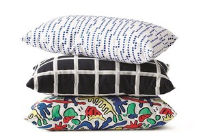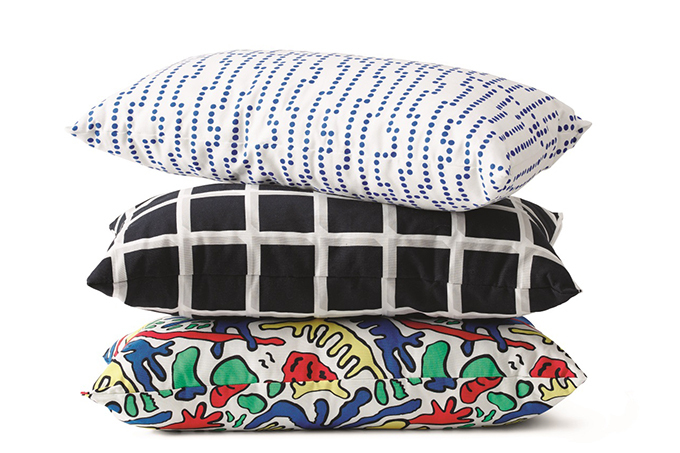クッションは、ホワイト地にブルーのドットをグラフィカルに敷き詰めた柄や、生き物のような有機的なモチーフをカラフルにプリントしたポップなものなど、様々なデザインを用意。葉っぱのモチーフのイラストをモノクロームで敷き詰めたカーテンや食器も登場する。デザイン性の高いユニークなアイテムたちは、部屋に置くだけで空間のムードをガラッと変えてくれる。
