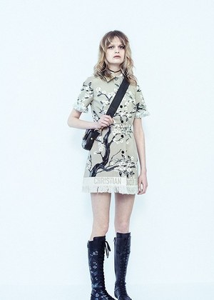 ラインナップは、ドレス、シャツ、ジャケットなど。共通して用いられたのは、繊細な花々のモチーフだ。フリンジ キャンバスにはプリントで、レザーにはハンドペイントでそれぞれ表現されている。1947年に生まれた”バー ジャケット”は再解釈され、ミニスカートと合わせた2ピースに。日本文化を象徴する着物は、モダンなエッセンスが投じられショートドレスへと変化している。
