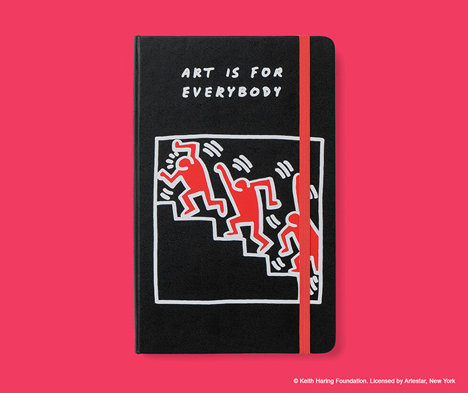 20世紀を最も象徴するアーティストの1人であるキース・ヘリング。そんな彼の作品を大々的にデザインに取り入れた限定版ノートブックは、ホワイトおよびブラックをそれぞれベースにしたカバーに、キース・ヘリングを象徴するシンプルでありながらもパワフルな人間や動物模様のグラフィックと、彼の信条である“ART IS FOR EVERYBODY”の言葉を描き、裏面にはモレスキンのロゴと共にヘリング直筆のサインを施したもの。