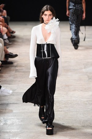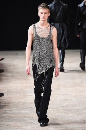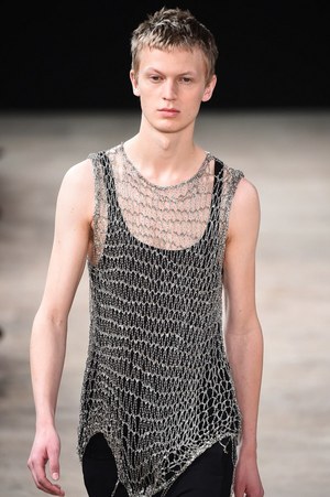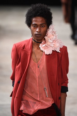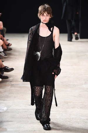一方で、個性の強いファブリックは、春夏らしさを強調している。極細の糸で編まれたニット、ピンク色のアイレットレース、編み上げたチェーン、タイダイ染めのような模様、なめらかな薄手のナッパレザーなど、ある時は力強さを求め、またある時はフェミニンを求める。中性的な装いは、意外にもたくさんの表情をもつ。