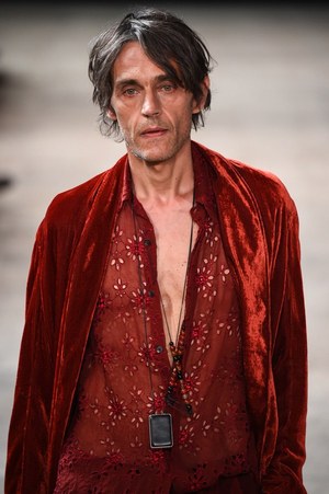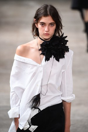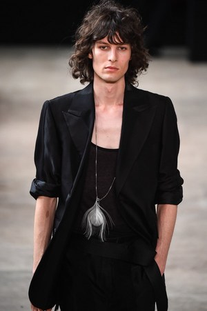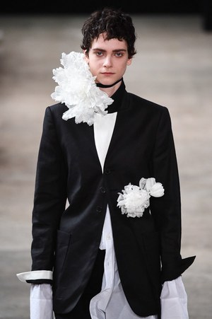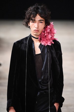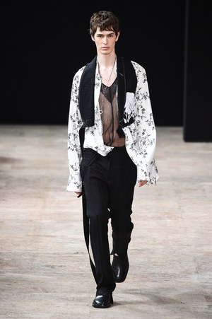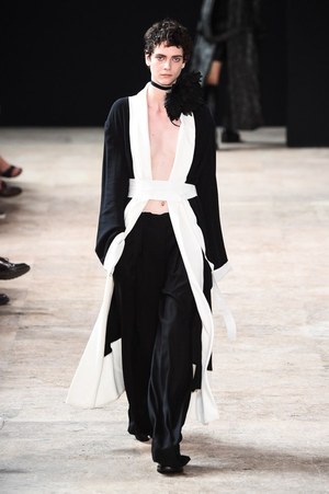 今季のスタイリングは、ラフ、ルーズといった言葉が似合うだろう。緩いワイドパンツは前明き部分がアシンメトリーで、さらにボタンは止めていない。ガウンやシャツは肩を落として気だるく、しかしながら気品を残して着こなしている。