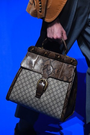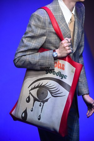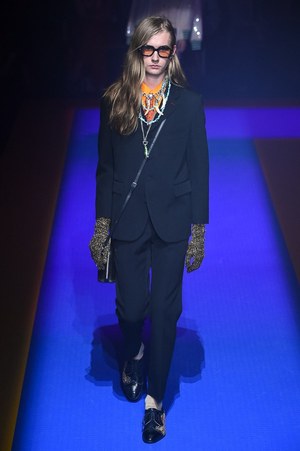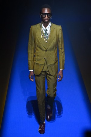 単体で見せると古典的であるが、やはりこれらもアレッサンドロ・ミケーレの手にかかれば、ジェンダーレスなグッチ流へと印象を変える。大振りなアクセサリーは多用され、首元にはネックレス、手元にはリングをオン。ウィメンズのような小さなショルダーバッグやデコラティブなリボン、ラメ入りタートルニットなども性差を超えた姿を形作り、コーディネートの無限の可能性を示唆するものとなる。