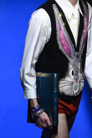 また、ミケーレによるメンズ服の醍醐味と言えば、キャラクターの起用であろう。今季は白雪姫とルーニー・テューンズのバッグス・バニー風ラビットをピックアップ。いずれもニット、ベストの上に大胆に顔を見せ、ミケーレの世界をアイコニックなものへと昇華させている。