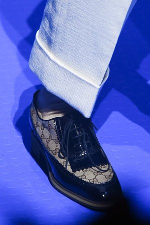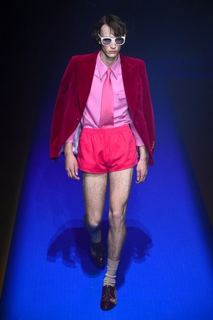 スーツスタイルと並んで、今季のグッチメンズを象徴するのものは、極短のショートパンツだろう。スイムウェアまたはアンダーウェアさながらのセクシーなボトムスが色を変え、素材を変え、何度も登場する。中には、シャツ&タイの紳士的な装いと交わりコーディネートされたルックもあった。