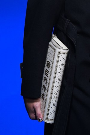昨シーズンに続き、グッチの新社屋で行われたショー。天井が高く開放的な空間には、いくつもの彫刻作品が並び、美術館さながらの雰囲気。会場中央には神殿を思わせる、真っ白な建築物まで展示され、知的な雰囲気が漂っていた。しかしこのムードは、ショーの始まりの音楽と共にがらりと表情を変えることとなる。天井から照らされた赤い光。ランウェイは青白く照らされ、会場に足を踏み入れた時に感じた、厳格なムードは姿を消すのであった。