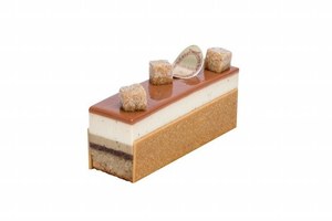 カフェの濃厚な風味と、軽くなめらかな食感を楽しめる「カフェ・オレ」。アーモンドとカフェの味わい広がるビスキュイに重ねた、カフェ風味の薄いプラリネ、カフェフレーバーのミルクムース、クリームが美しい層を形成する。さらに、ブロンドチョコレート“ドゥルセ”のプレートやクランブルのキューブを飾り、ナッツとカフェの風味を存分に堪能できる、見た目にも華やかなスイーツに仕上がっている。