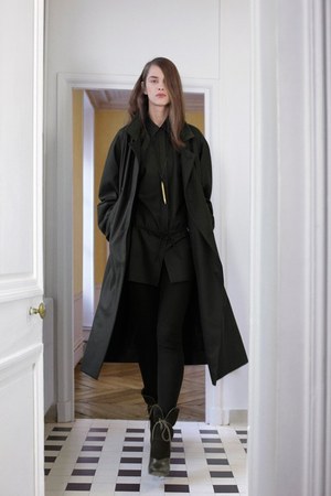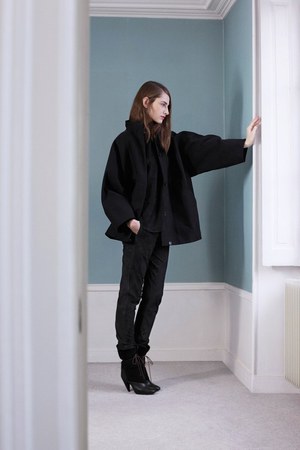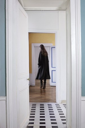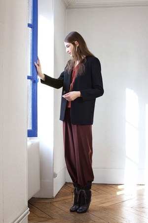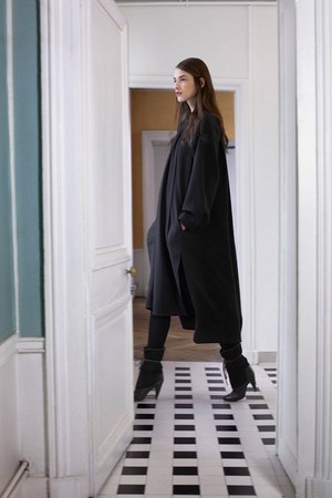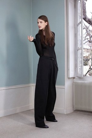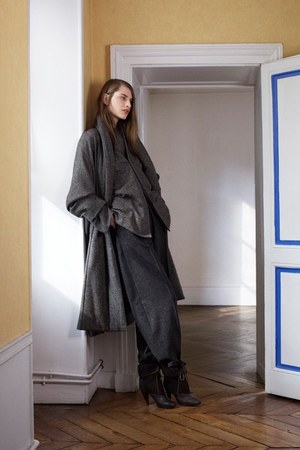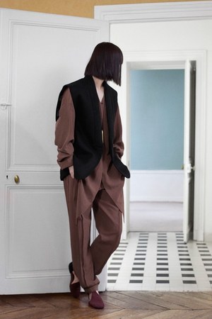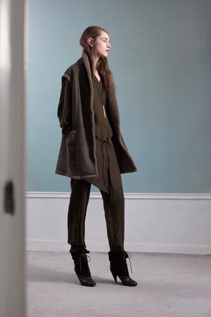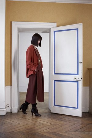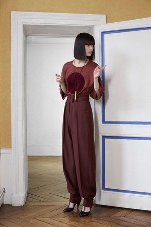 カラーはローズや乳白色、ブロンズをメインに使用し、全体的に温かみがあり、着る人に自然に馴染みやすい雰囲気。またマスキュリンなコートやミリタリー仕様のダッフルコート、たっぷりとしたシルエットのパンツに加え、キモノスリーブのニットやトップスが今季の特徴的なアイテムだ。