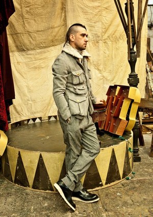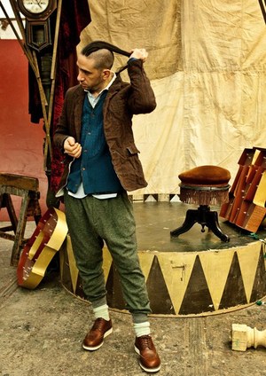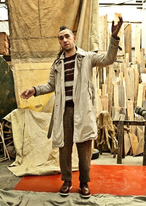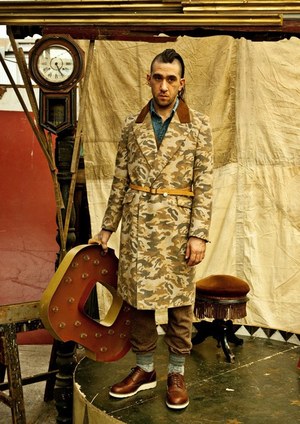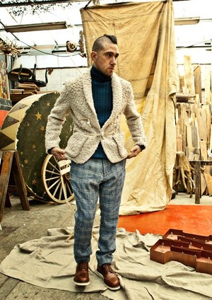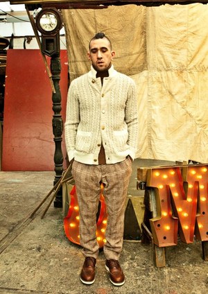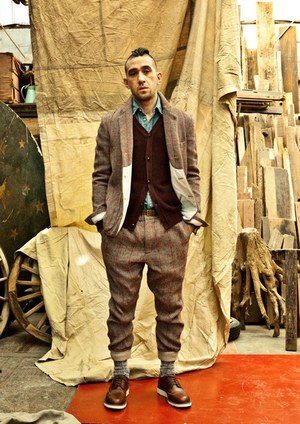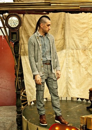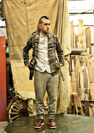 わざとシワ加工の入った生地は、長年大切に着こんだ1着に見えるようにしたもの。少しくたびれたように見えるコートは、どこか愛着を感じさせる。全体的に茶色やベージュ、深緑やえんじ色などの温かみのある色でまとめている。ウエストからヒップにかけてゆとりのあるデザインのパンツは、裾にかけてゆるやかにテーパードがかかっている。さらに裾を折り返して丈を短くすることで、重たすぎない着こなしに。