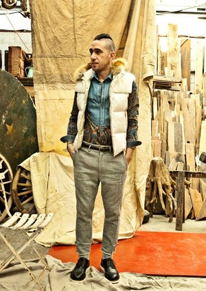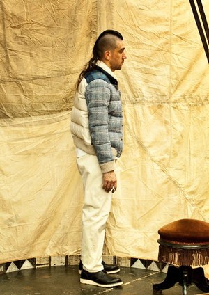 色褪せたようなカラーをベースにしつつも、迷彩柄やチェック柄、レオパード柄やペイズリー柄などポップな柄をいたるところに取り入れ、垢抜けた印象に。デニムとペイズリー柄の切り替えが面白いシャツと軽やかな白のダウンベスト、ライトグレーのパンツでまとめたスタイルは、大人の遊び心満載だ。