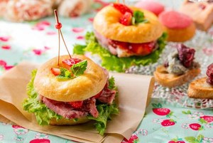 ・スイーツ:フレッシュ苺(生)、苺ショートケーキ、苺ロールケーキ、ダブルベリー(苺とラズベリー)のケーキ、苺のマフィン、苺のスコーン、苺のボンボンショコラ、苺のタルトレット、苺のマカロン、ラズベリーのクッキーシュークリーム、苺のゼリー、苺とゴルゴンゾーラのクロスティーニ