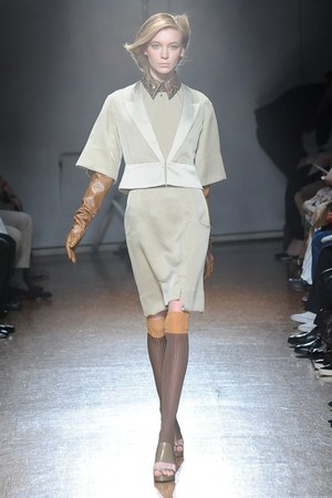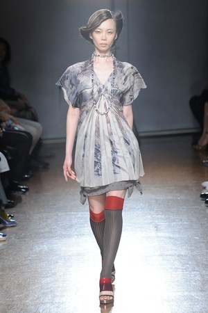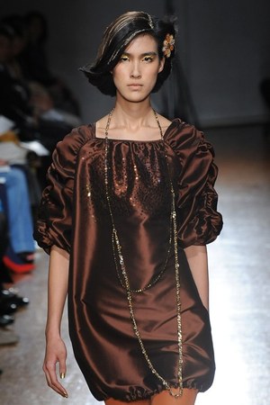にじみ技法でプリントされた花柄は、イエローやブルーなどの軽やかなインパクトカラーと、ラメやスパンコールの煌めきが印象的。クリムトゴールドの金箔は、ラメ糸を編み込んだ圧縮ニット、緞子ライクな箔プリント、水墨画の繊細な諧調を表現した転写プリントでモダンに蘇った。19世紀のヨーロッパ人を驚かせた東洋の手仕事は、ローゲージニットやレーシーなニットのぬくもりに表れている。その表面に輝くメタルエレメントはジュエリーのようにボディを彩った。