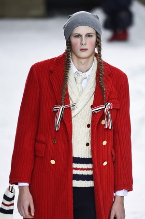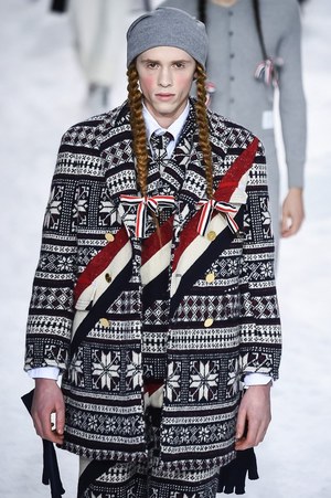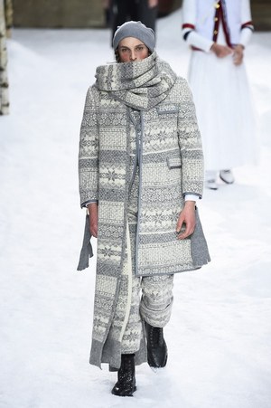 そして、グレーとホワイト、レッド、ブルーといったトム ブラウン独特のカラーリングによるクラシックなムードはもとより、今シーズンはケーブルニットやノルディックニットによる穏やかさと、すべてチェック柄で統一したトラッドなムードが流れ出す。そして、そこにはトム ブラウンらしさがいっぱい詰まっていて、例えば、ノルディック柄の中にはトム・ブラウンの愛犬が隠れているし、チェック柄はブランドのアイコニックカラーが採用されている。先に述べたコートのベンツにだって、ブランドのアイコニックなカラーがちらりと顔を覗かせている。