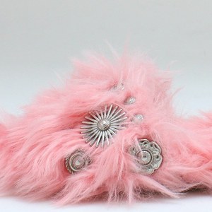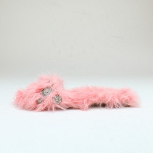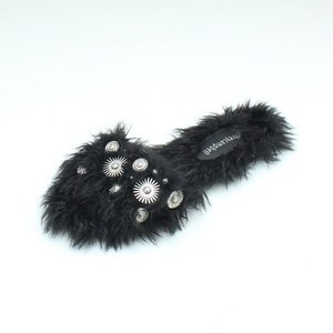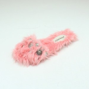 新作ファースリッパサンダルは、春にぴったりなポップなデザイン。毛足の長いフェイクファーを使用したことで、ぬいぐるみのように愛らしいビジュアルに。アッパーには、アンティークシルバーで統一されたスタッズを配した。柔らかな印象のファーのアクセントとなり、シューズ全体を引き締めてくれる。また、スタッズのデザインは、大小様々のフラワーモチーフを採用するなど、拘りを散りばめた。