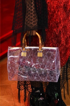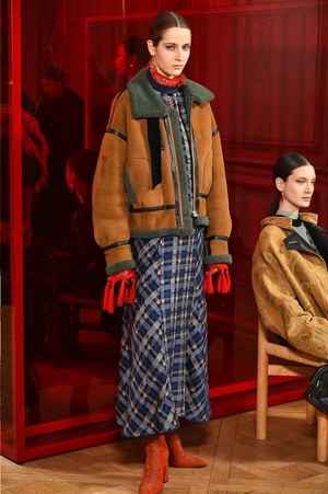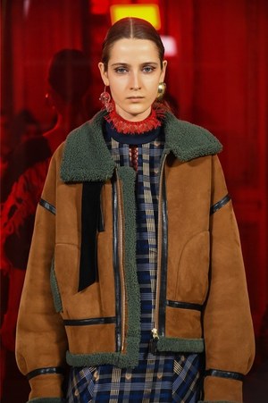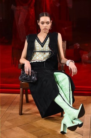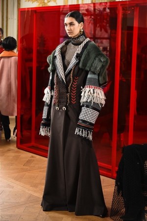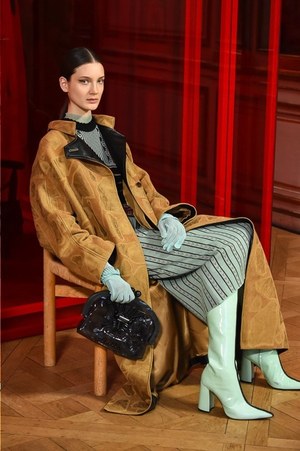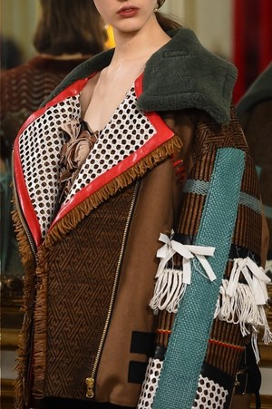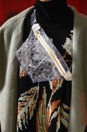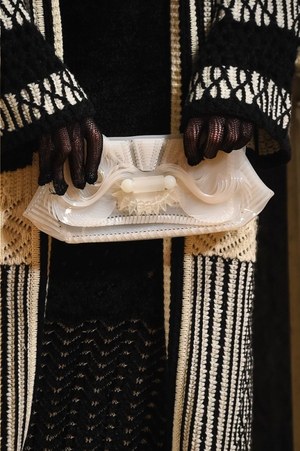シャルロットの作品から直接的に取り入れられたのは、例えば「編む」という表現。日本の籐に影響を受けたシャルロットの椅子は、編まれたレザーコートへと変貌する。また、シャルロットが重視したモダニティと伝統との融合は、1920年代のカッティングやブロケードを使用したストレートで現代的なコートなどに見て取れる。