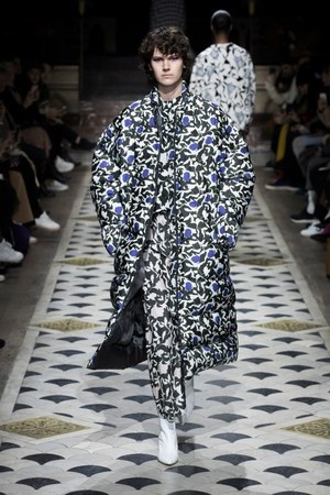 一方で、スポーティーなピースであるダウンの取り入れ方にも注目。男性的なイメージの強いマテリアルは、ナローなショルダーラインや背面の膨らみ、マフラーのように体に巻きつけるといった丸みを帯びさせるシルエットによってエレガントに仕上げられている。