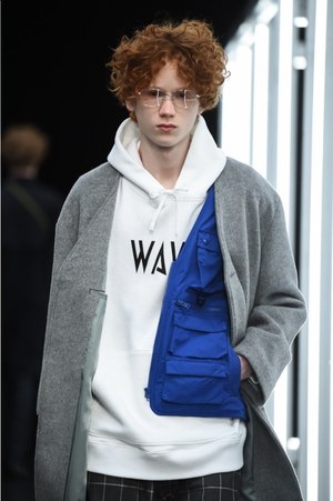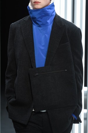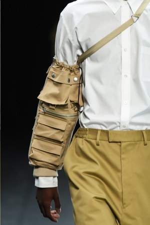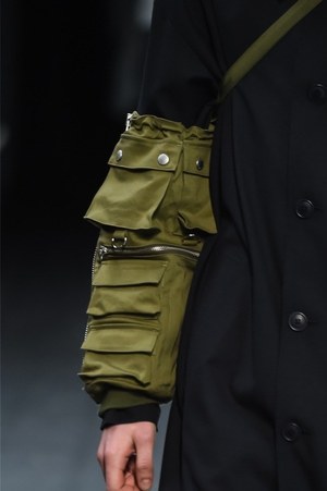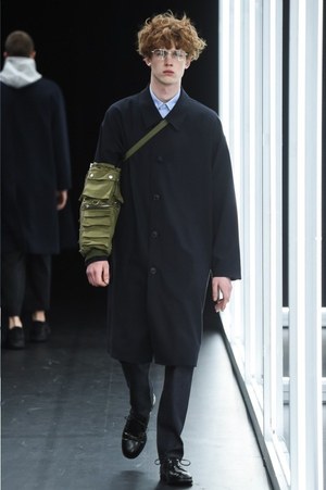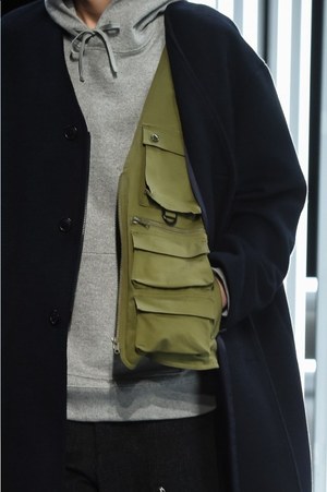 "実験室"で作られたアイテムは奇想天外なものばかり。腕に巻き付いたミリタリーテイストのアイテムは、新しいジャンルのバッグといったところだろうか。スラックスを穿き、コートを羽織ったドレス感のあるコーディネートに合わせられたそれは、今まで感じたことのない雰囲気をルックに落とし込む。
