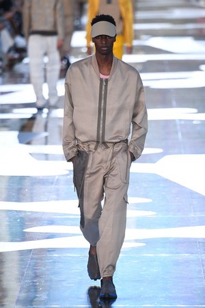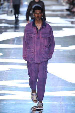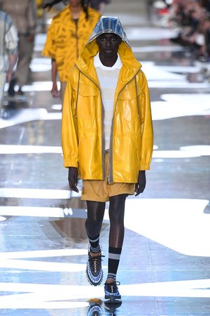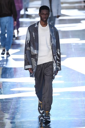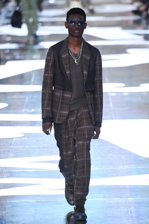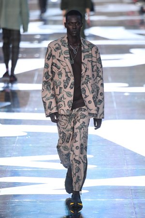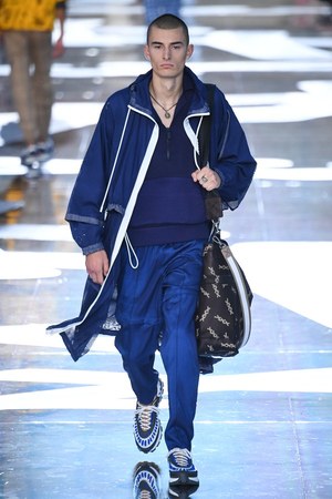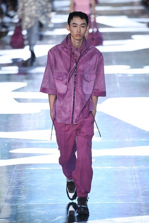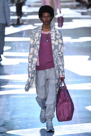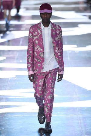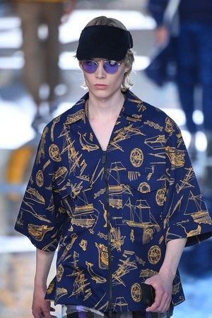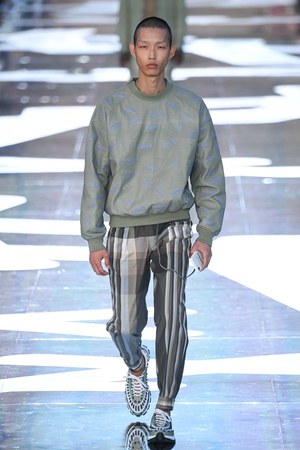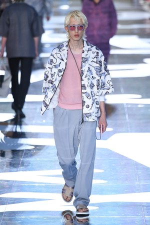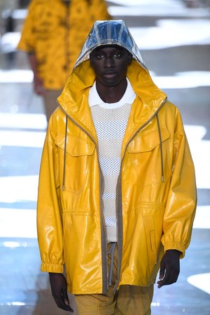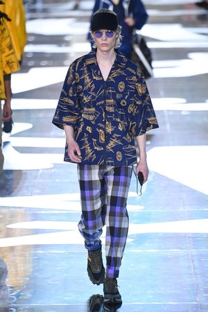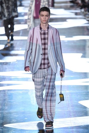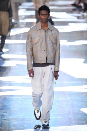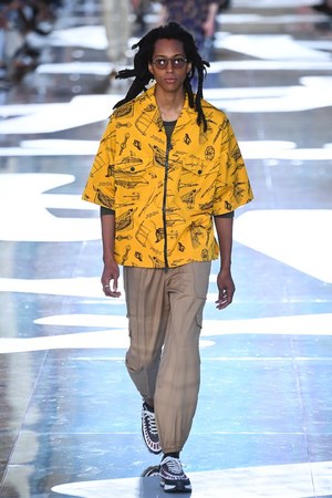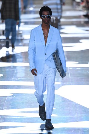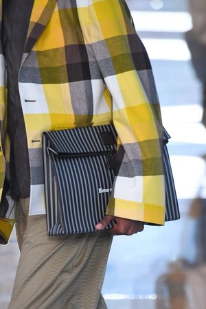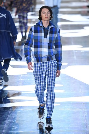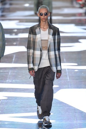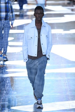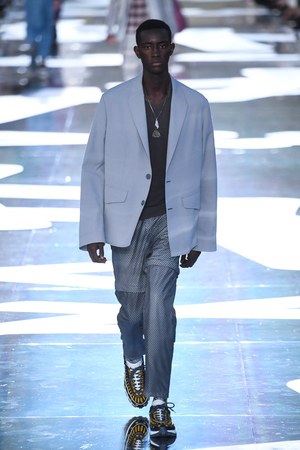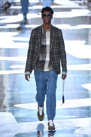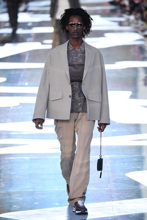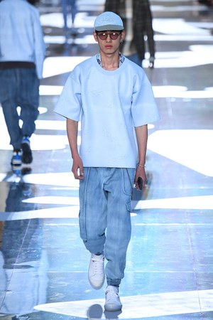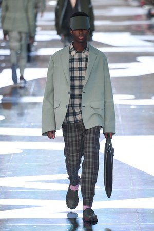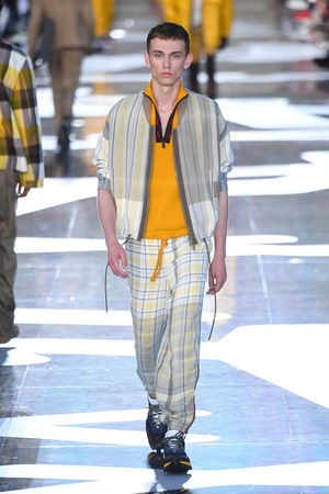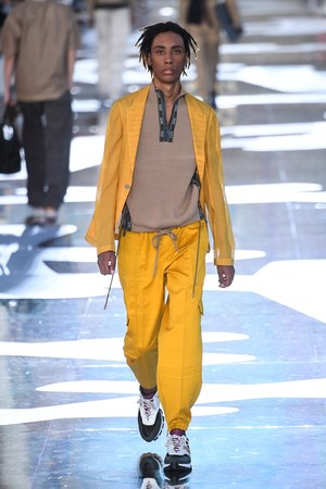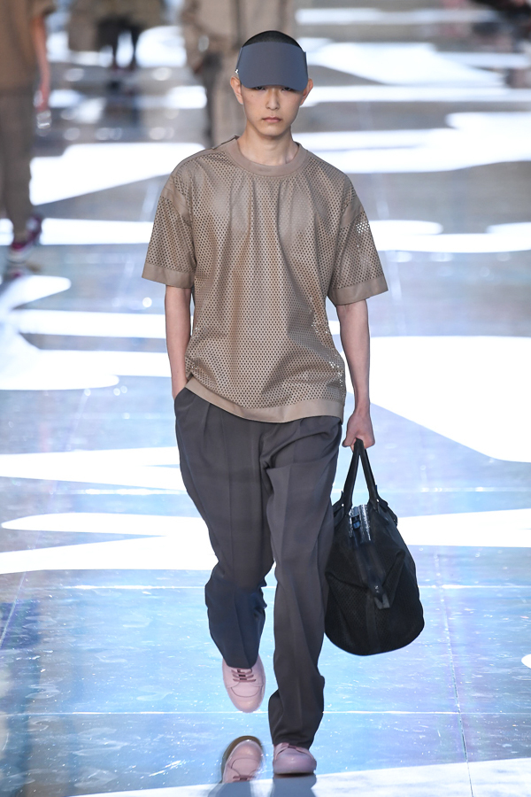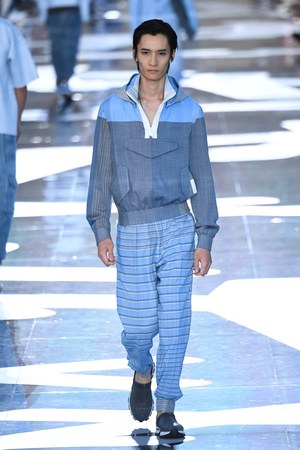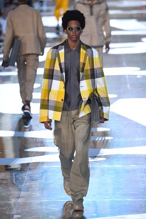 今季は、ストリート、あるいはスポーティな要素のふり幅が広い。ブリーチデニムはストリートの筆頭で、オーバーサイズのパーカーとのセットアップも打ち出した。また、スポーティーなもので言えばテニスプレーヤーを描いたプリントで、フルジップのシャツから端正なスーツに至るまでを彩っている。いつもならトラッドな印象のチェック柄には、爽やかなブルーのコントラスト、さらには目の覚めるようなイエローを織り交ぜたポップな演出も登場させている。