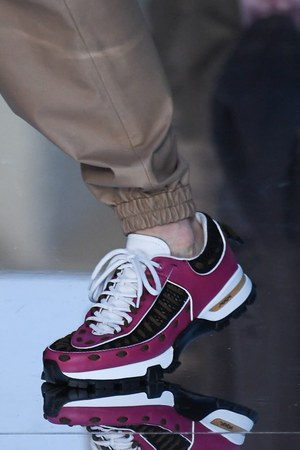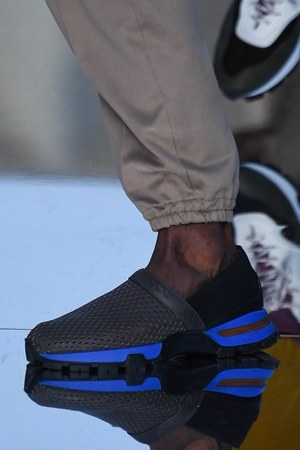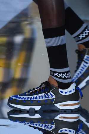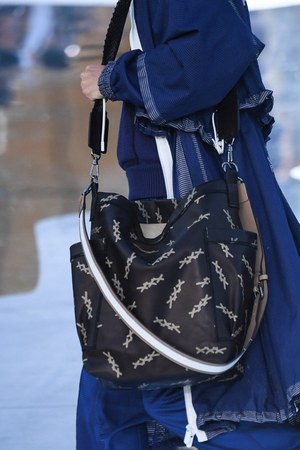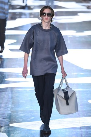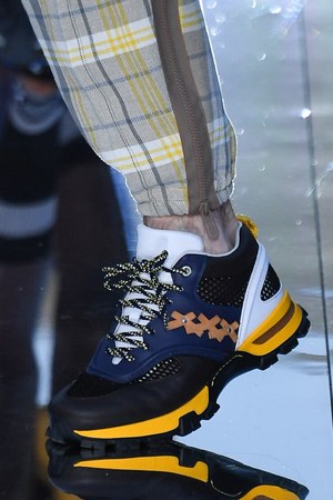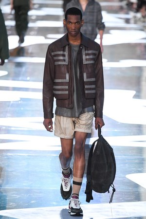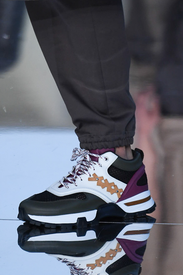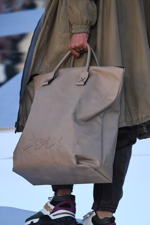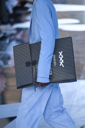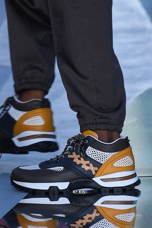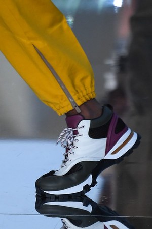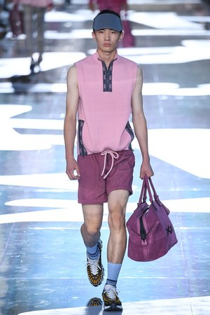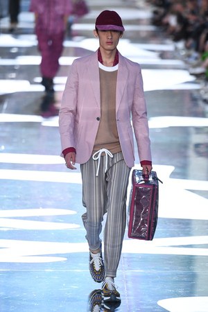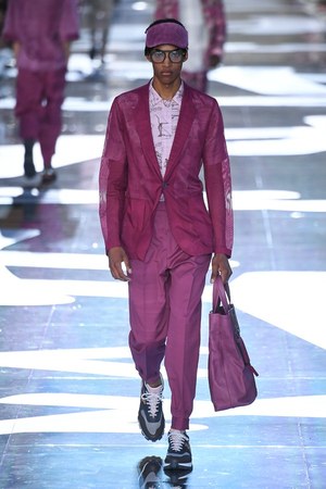 小物類は遊び心たっぷりに、それでいて高級感は少しも失っていない。糸を複雑に編み込んだスニーカー、艶やかなグログランテープで甲を覆うスポーツサンダル、アイコンが型押しされたサコッシュ、バイオレットのスエードを用いたサンバイザー、そしてまるで書類ケースをデフォルメしたようなクラッチバッグまで。