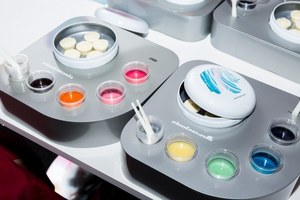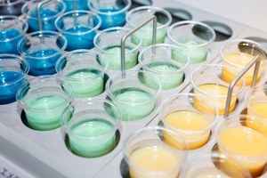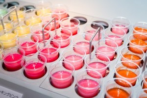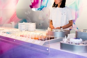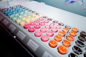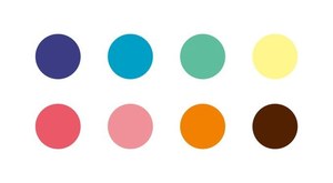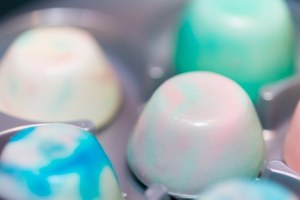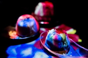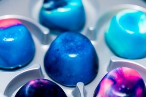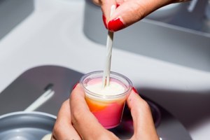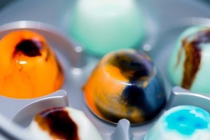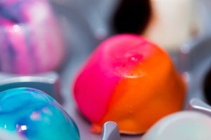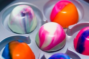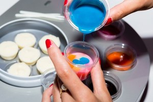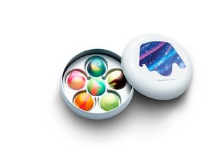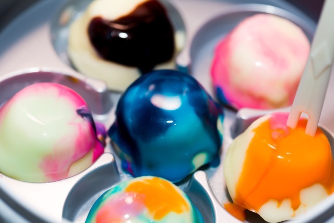1、ネイビーやエメラルド、パステルピンク、オレンジなど鮮やかな8色のチョコレートソースから4色を選びブレンド