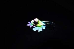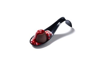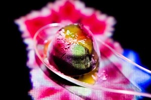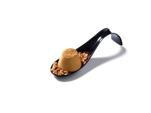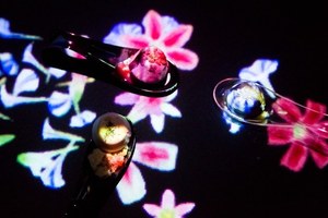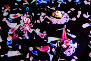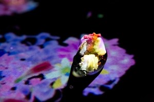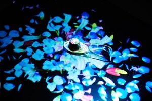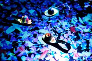room"ヒカリ"では、スプーンに盛り付けられたピノがサーブされると、チームラボのデジタルコンテンツが始まる。ピノを乗せたスプーンを動かしたり置いたりすると、その動きに合わせて映像が反応。映し出された色艶やかな花が、美しい花びらを散らしながら、テーブル一杯に広がっていく。