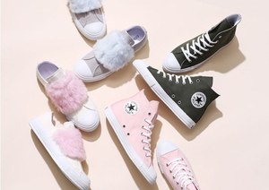 コンバース(CONVERSE)はフェミニン&エレガントな新作オールスターを用意。「ALL STAR S COLORS HI」は、「オールスター S」をレディース向けにアレンジしたモデル。アーモンドトゥや細幅のシューレースで女性らしさを加えている。「ALL STAR PASTELFUR SLIP OX」は、パステルカラーファーが印象的な1足だ。