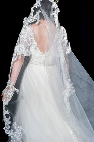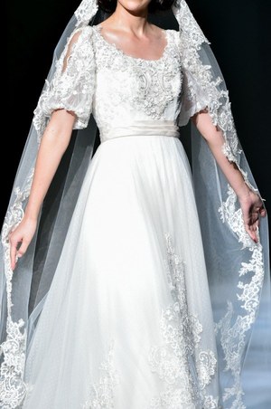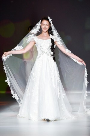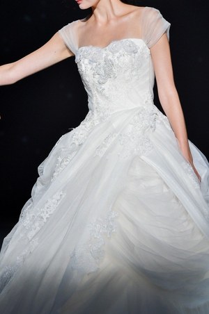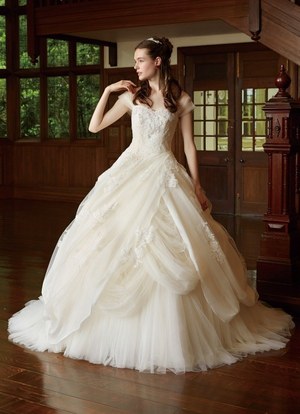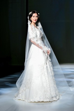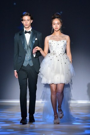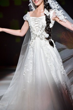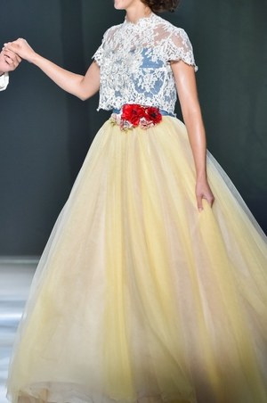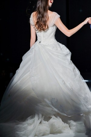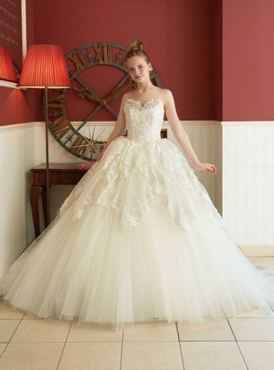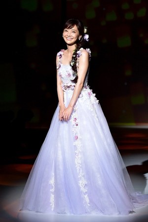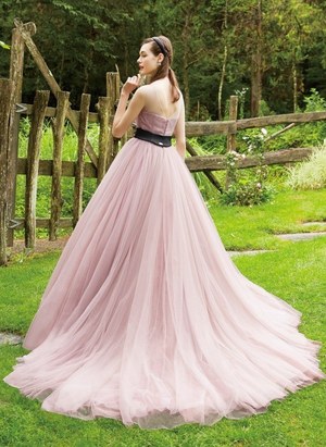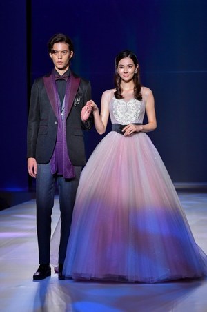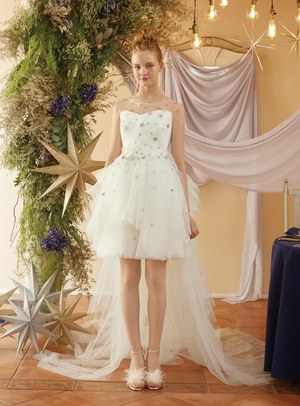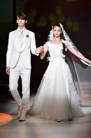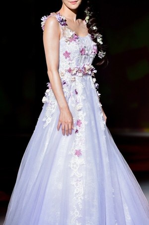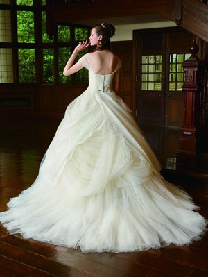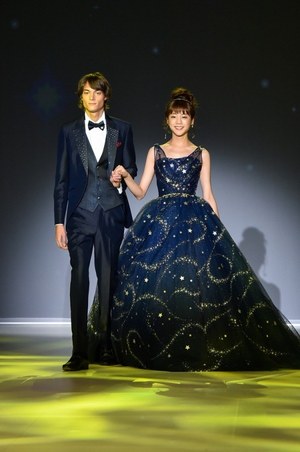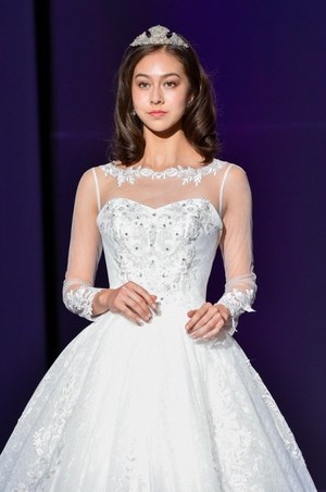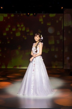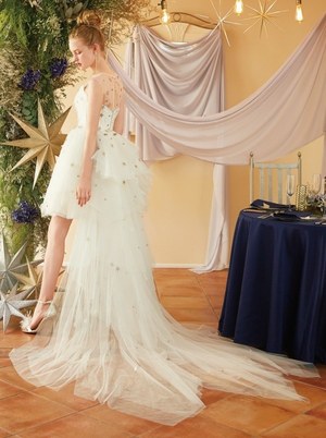 最後は『美女と野獣』のヒロイン・ベルをイメージしたドレス。ベルのドレスの特徴であるオフショルダーに、ドレープをアシンメトリーに施した。胸元にはバラをイメージしたリボン刺繍モチーフをあしらってエレガントな1着。